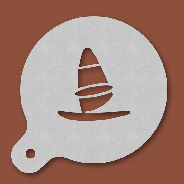 Cappuccino-Schablone Windsurfer, Außendurchmesser 120 mm, Motivdurchmesser ca. 70 mm, aus Edelstahl mit Handgriff und integriertem Aufhänger, spülmaschinengeeignet, Lieferung in Verkaufsverpackung mit Kartoneinlage und Bedienungsanleitung