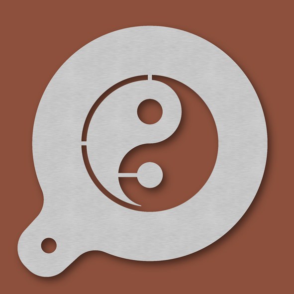 Cappuccino-Schablone Yin und Yang, Außendurchmesser 120 mm, Motivdurchmesser ca. 70 mm, aus Edelstahl mit Handgriff und integriertem Aufhänger, spülmaschinengeeignet, Lieferung in Verkaufsverpackung mit Kartoneinlage und Bedienungsanleitung