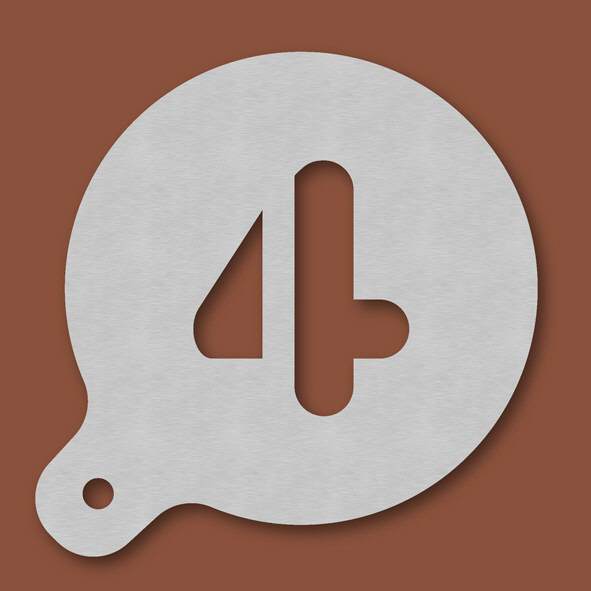 Cappuccino-Schablone Zahl 4, Außendurchmesser 120 mm, Schrifthöhe ca. 65 mm, aus Edelstahl mit Handgriff und integriertem Aufhänger, spülmaschinengeeignet, Lieferung in Verkaufsverpackung mit Kartoneinlage und Bedienungsanleitung