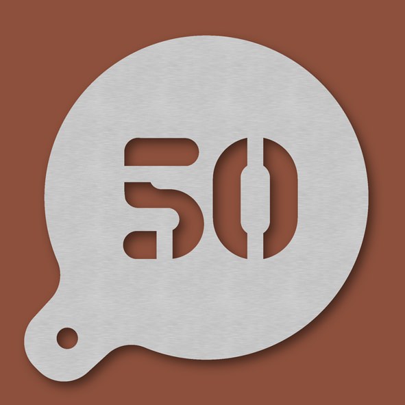 Cappuccino-Schablone Zahl 50, Außendurchmesser 120 mm, Schrifthöhe ca. 45 mm, aus Edelstahl mit Handgriff und integriertem Aufhänger, spülmaschinengeeignet, Lieferung in Verkaufsverpackung mit Kartoneinlage und Bedienungsanleitung