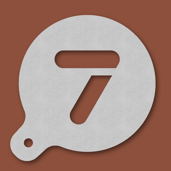 Cappuccino-Schablone Zahl 7, Außendurchmesser 120 mm, Schrifthöhe ca. 65 mm, aus Edelstahl mit Handgriff und integriertem Aufhänger, spülmaschinengeeignet, Lieferung in Verkaufsverpackung mit Kartoneinlage und Bedienungsanleitung