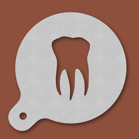 Cappuccino-Schablone Zahn, Außendurchmesser 120 mm, Motivdurchmesser ca. 70 mm, aus Edelstahl mit Handgriff und integriertem Aufhänger, spülmaschinengeeignet, Lieferung in Verkaufsverpackung mit Kartoneinlage und Bedienungsanleitung