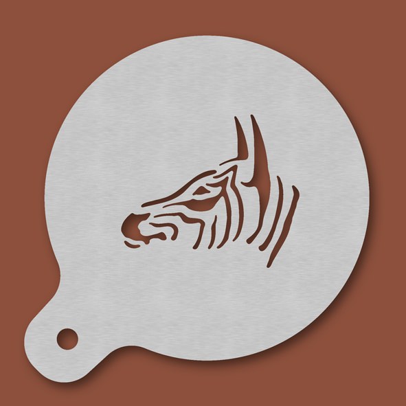 Cappuccino-Schablone Zebra, Außendurchmesser 120 mm, Motivdurchmesser ca. 70 mm, aus Edelstahl mit Handgriff und integriertem Aufhänger, spülmaschinengeeignet, Lieferung in Verkaufsverpackung mit Kartoneinlage und Bedienungsanleitung