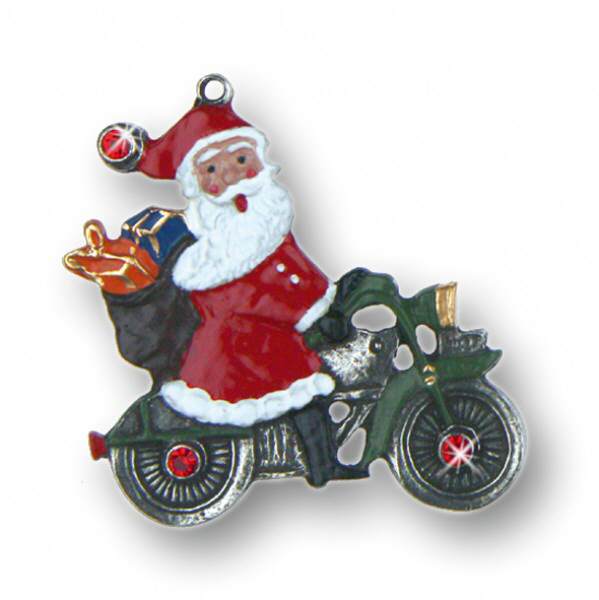 Zinnfigur Weihnachtsmann auf Motorrad mit 6 Steinen rot, doppelseitig, H: 4,5 cm, in Geschenkverpackung
