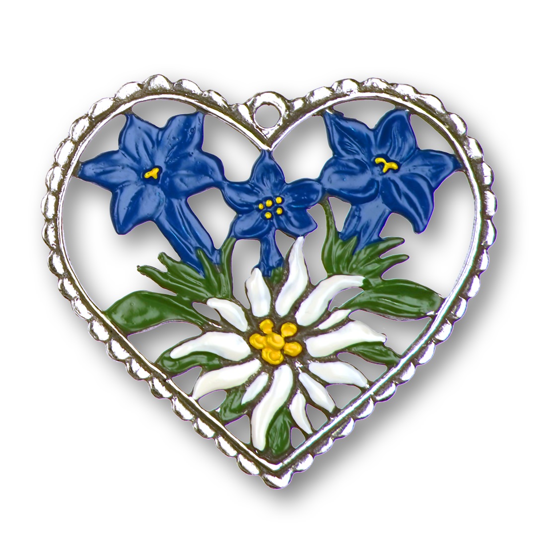 Sie sind hier: Werbemittel123.de » Werbemittel aus Zinn » Figuren doppelseitig Zinnfigur Herz Enzian und Edelweiß Zinnfigur Herz Enzian und Edelweiß, H: 5,0 cm