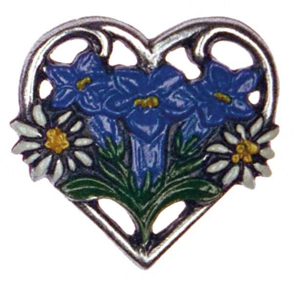 Magnet mit Zinnfigur Herz Edelweiß + Enzian, H: 3,0 cm