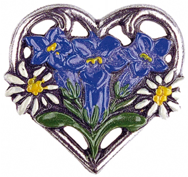 Anstecker Herz Edelweiß und Enzian, Zinn 93%, H: 3,5 cm