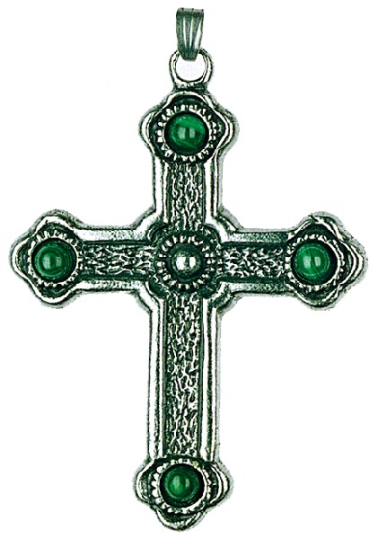 Zinnfigur Kreuz antik mit vier grünen Steinen, H: 6,5 cm