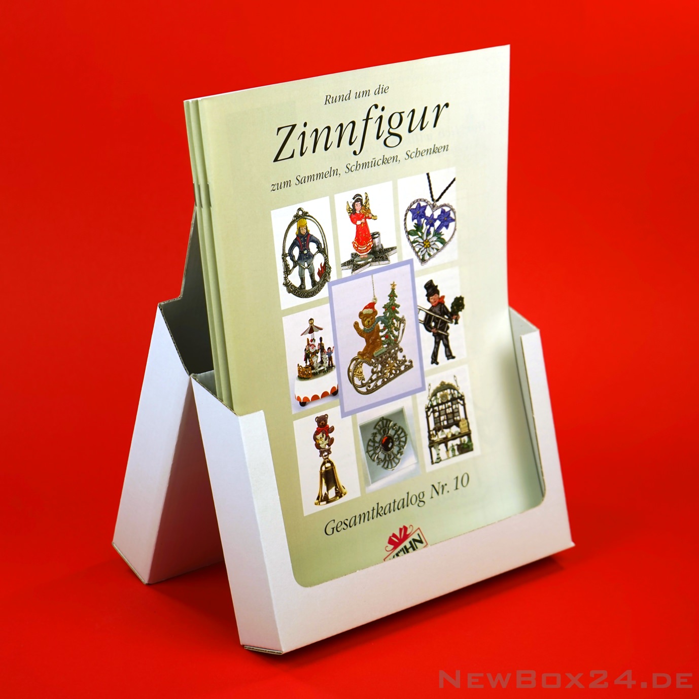 Prospektständer 656-04 - 297 x 210 x 35 mm (Innenmaße - für DIN AA Hoch), Wellkarton glatt in Standardfarbe weiß (Farben gegen Aufpreis möglich), Lieferung ungefaltet