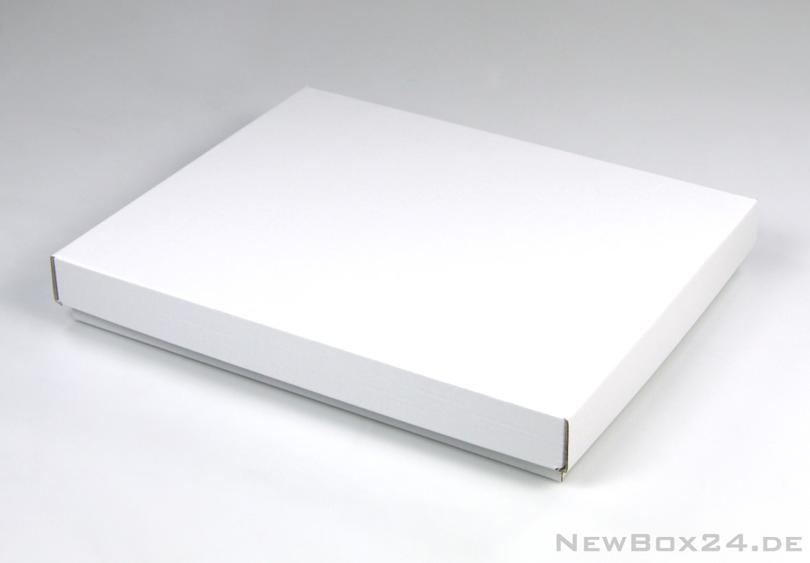 Stülpdeckelbox 401 - 300 x 240 x 40 mm (Innenmaße), Wellkarton glatt in Standardfarbe weiß (Farben gegen Aufpreis möglich), Lieferung ungefaltet